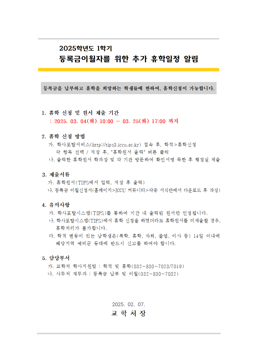 2025학년도 1학기 등록금 이월자를 위한 추가 휴학 일정 알림(3/4 ~ 3/25까지)
