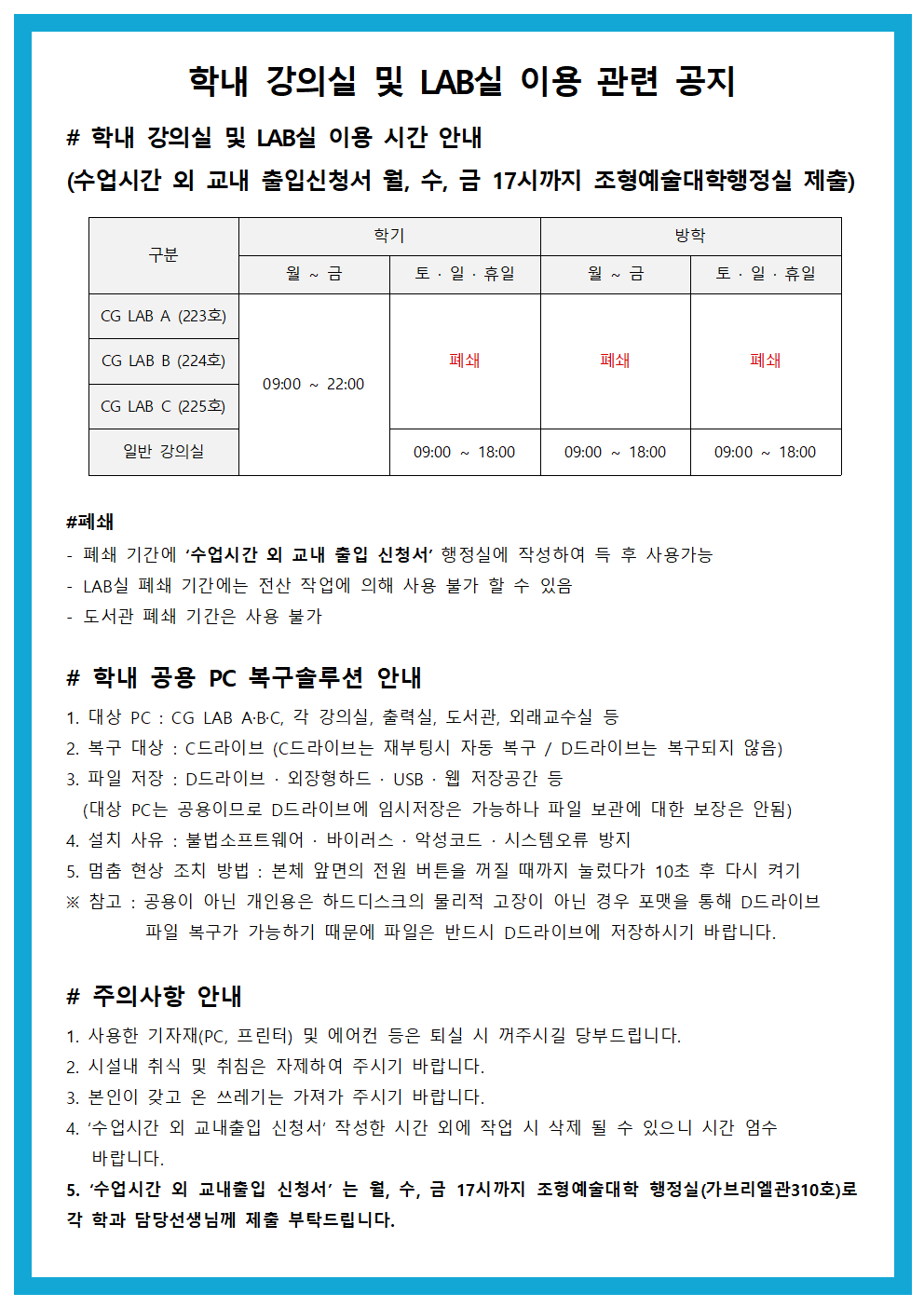 야간작업신청 LAB실 및 강의실 이용관련 공지사항(2025학년도 1학기)