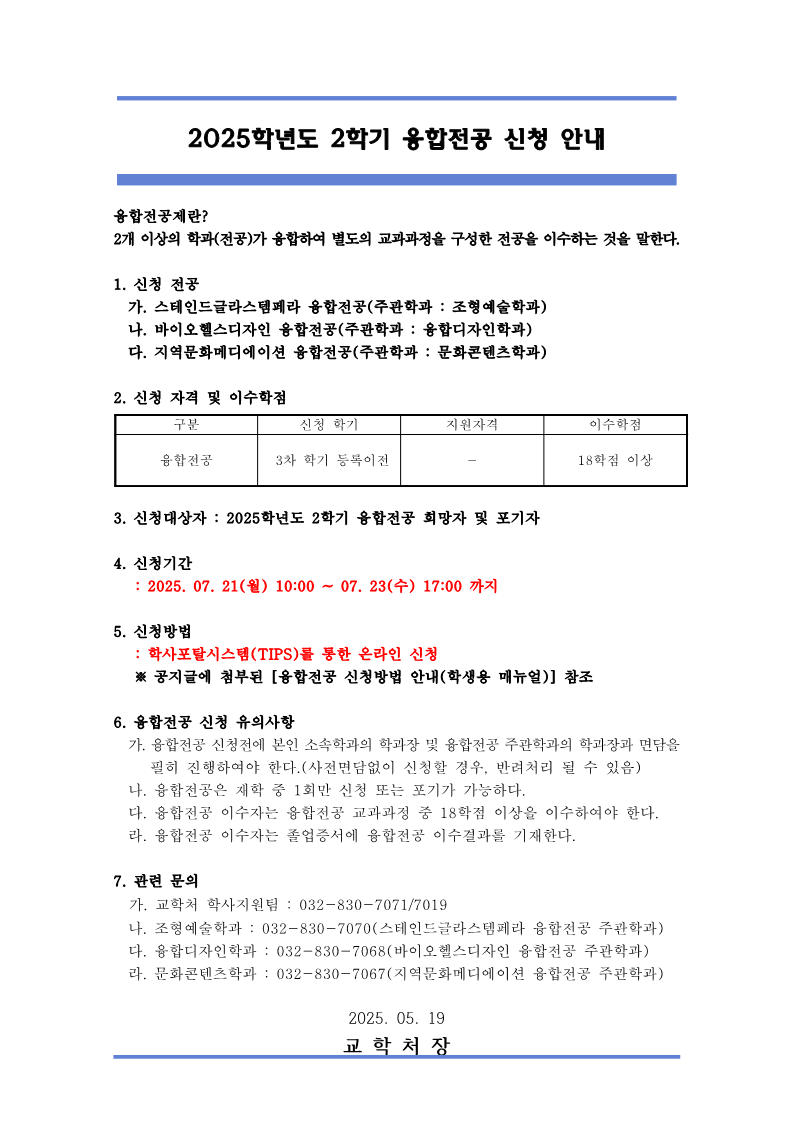 2025학년도 2학기 융합전공 신청 기간 안내(7월 21일~23일/3일 간 신청)